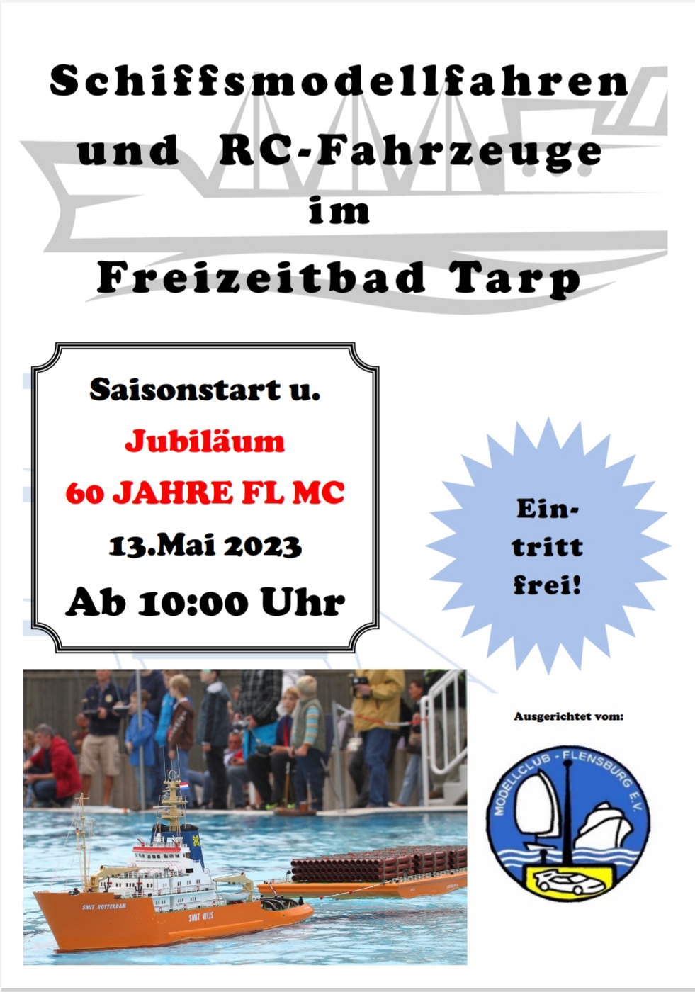 Hallo liebe Modellbauer Der Modelclub Flensburg möchte euch, zum Anlass seines 60 jährigen bestehens, auf ein Schaufahren am 13.05.2023 von 10:00 bis 18:00 Uhr einladen. Die Einladung betrifft nicht nur Schiffsmodelle, sondern alle Modellbausparten. Der Kiosk wird an diesem Tag schon geöffnet sein und für unser leibliches Wohl sorgen. Gerne dürft ihr diese mail auch …
