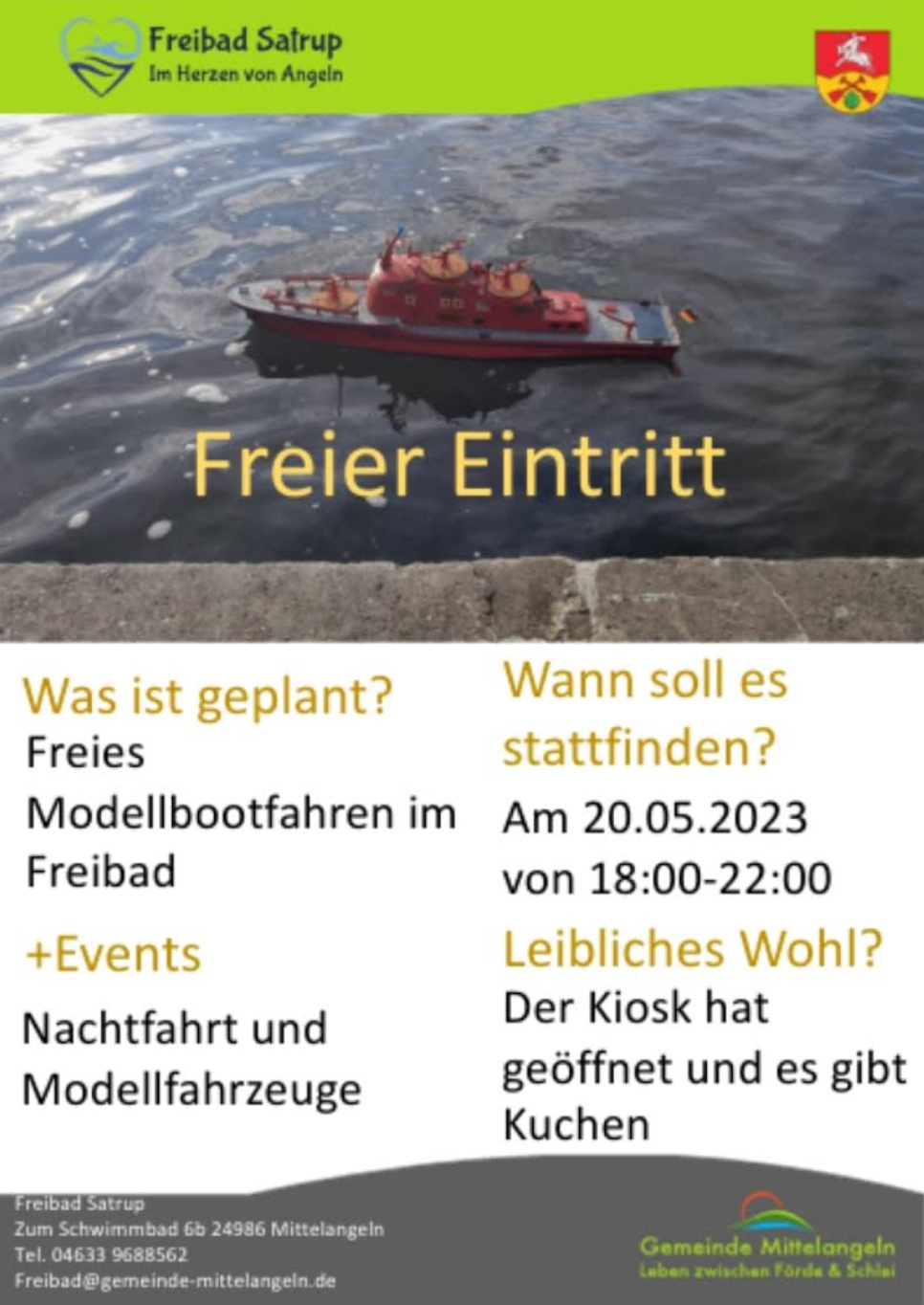 Moin moin Modellbauer, ich möchte Euch zu unsererm  Schaufahren im Freizeitbad Tarp Walter-Saxen-Str. 1, 24963 Tarp am 17.09.2022 einladen. Das Schaufahren zu Wasser und zu Lande wird von 12:00 Uhr bis ca 18:00 Uhr dauern. Wir hoffen auf schönes Wetter und ein "hyggelig" Schaufahren. Tische, Stühle, Pavillon bring bitte selber mit. MC-Flensburg